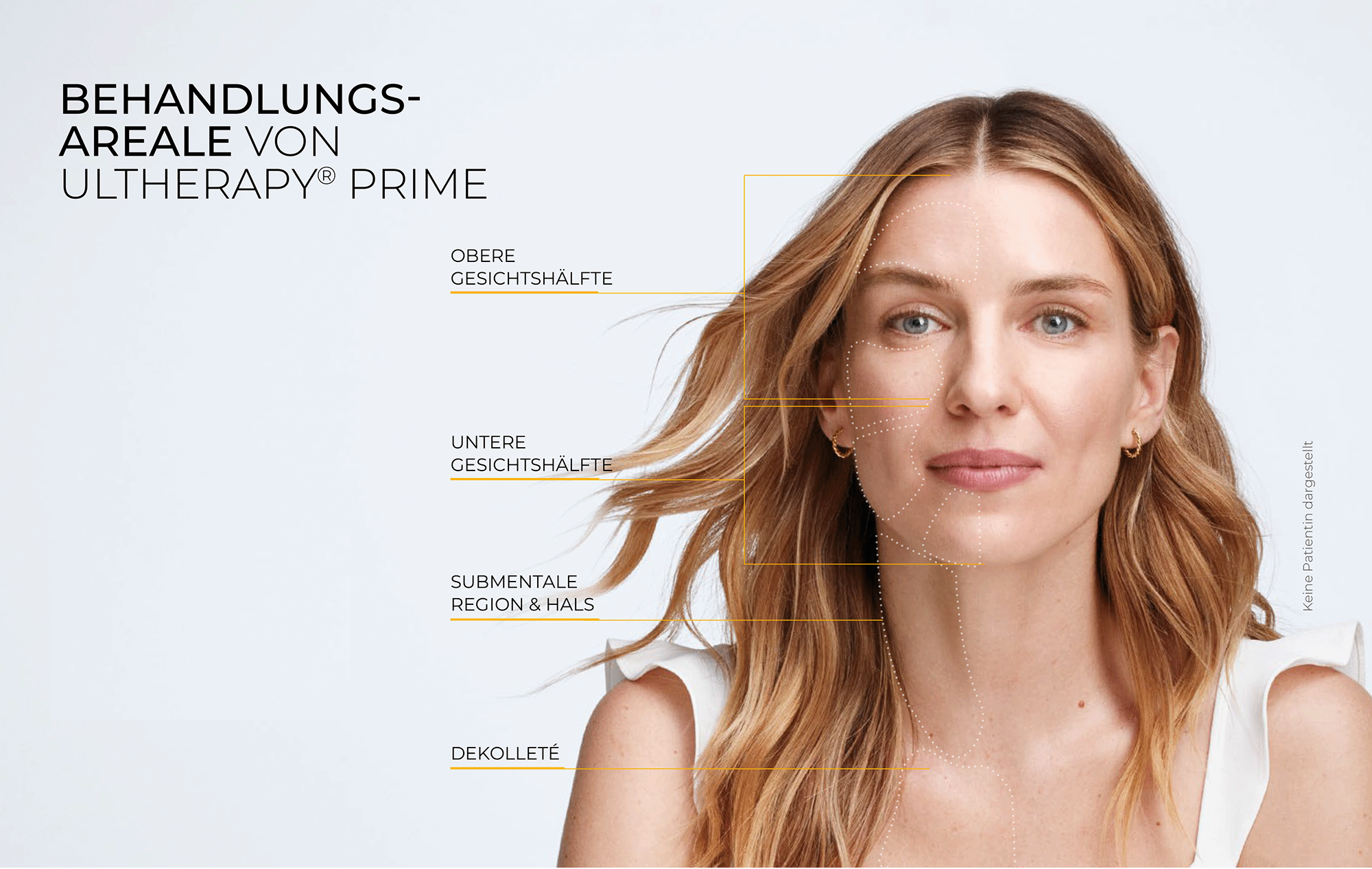 Ultherapy Prime ist eine nicht-invasive, von der FDA zugelassene Behandlung gegen Hauterschlaffung. Dabei wird mikrofokussierte Ultraschallenergie eingesetzt, um gezielt tiefere Hautschichten anzuregen und dort die Kollagenproduktion zu stimulieren. Dies kann zu einer strafferen, festeren und jugendlicheren Haut führen. Die Behandlung wird vor allem eingesetzt bei Hauterschlaffung („Sagging“) in Bereichen des unteren Gesichts, Hals, Stirn und Dekolleté. Sie kann auch zur Reduktion von feinen Linien und Falten im Gesicht und am Hals eingesetzt werden.